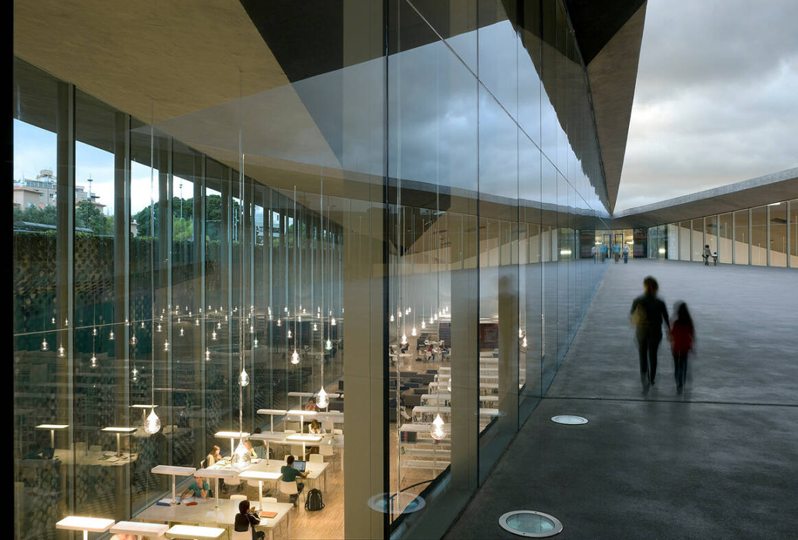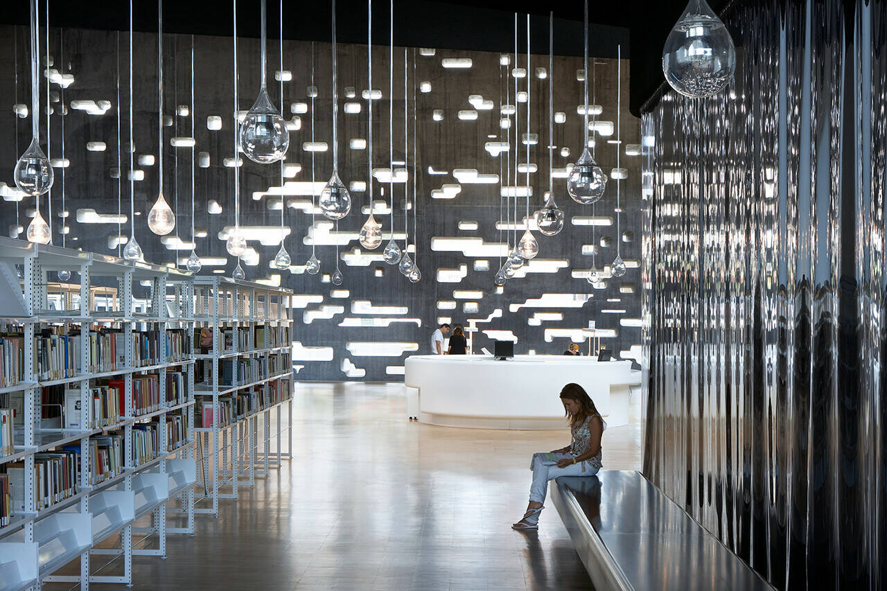 Waar in het souterrain de jeugd- en jongerenbibliotheek domineren, hebben op de begane grond de vierhonderd studieplekken de overhand. Metershoge ramen zorgen voor een fantastische lichtinval, een effect dat in de avonduren zijn gelijke moet erkennen in de honderden ‘neerdwarrelende’ lampen die de impressie wekken dat je als bezoeker in een enorme druipsteengrot vol oplichtende stalactieten terecht bent gekomen.
