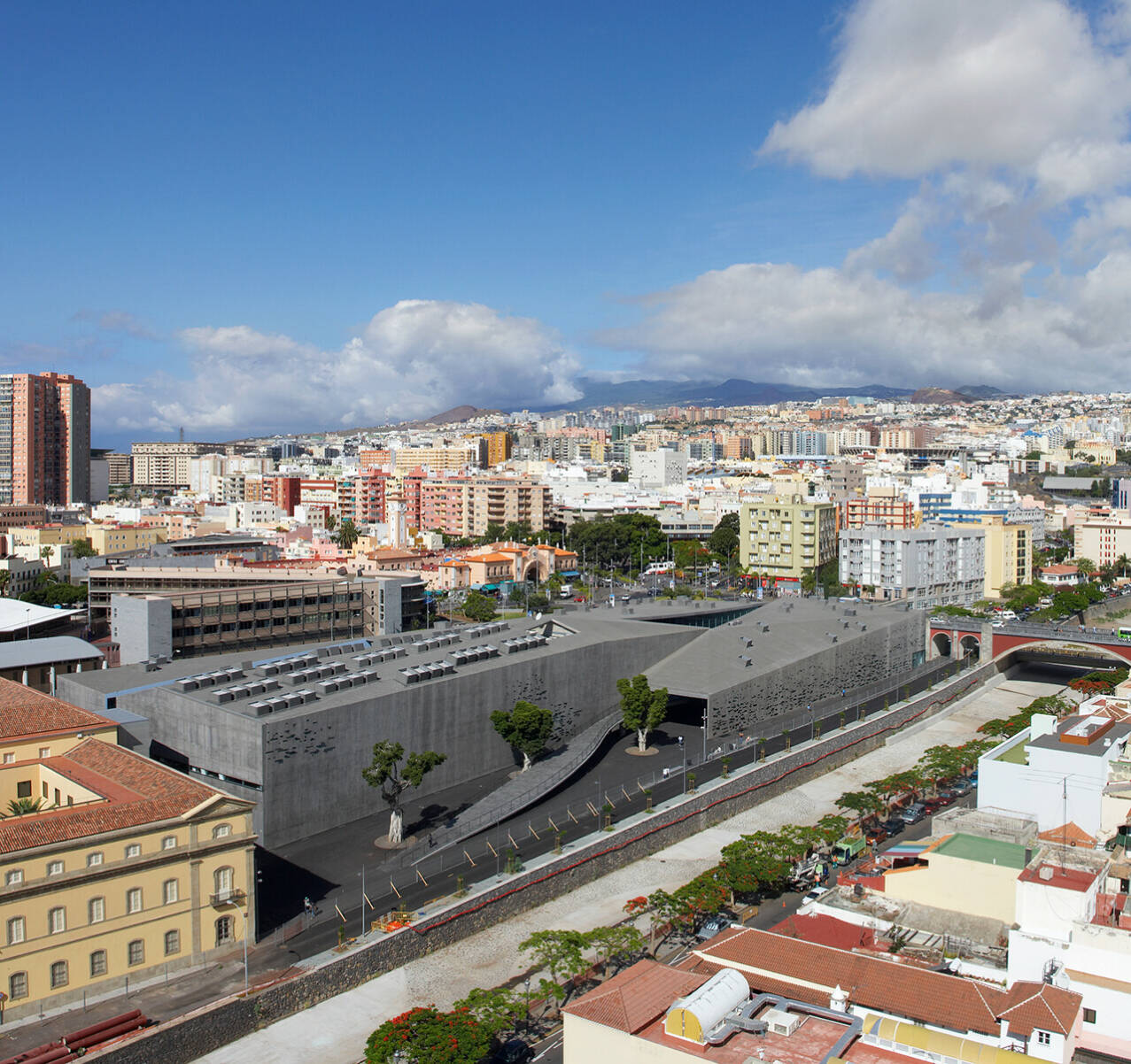 Tenerife is het eiland van de eeuwige lente. Het behoort tot Spanje en ligt vierhonderd kilometer voor de kust van Marokko en de Westelijke Sahara te blakeren in de Atlantische Oceaan. Er leven ongeveer 900.000 mensen, van wie 200.000 in de hoofdstad Santa Cruz. Jaarlijks bezoeken tussen de vier en vijf miljoen toeristen het eiland. Een favoriet uitstapje is dat naar de vulkaan Teide, met ruim 3.700 meter de hoogste berg van Spanje. Op vrijwel alle dagen van het jaar schijnt de zon uitbundig, en van dat gegeven hebben de architecten Herzog & De Meuron dankbaar gebruikgemaakt bij het ontwerpen van het TEA. Niet alleen de hoge glazen wanden verbinden binnen en buiten op een even logische als prettige manier, dat doen ook de 720 verschillende pixelvormige ruiten die de massieve betonnen buitenmuren maar liefst 1.200 keer op speelse manier doorbreken.