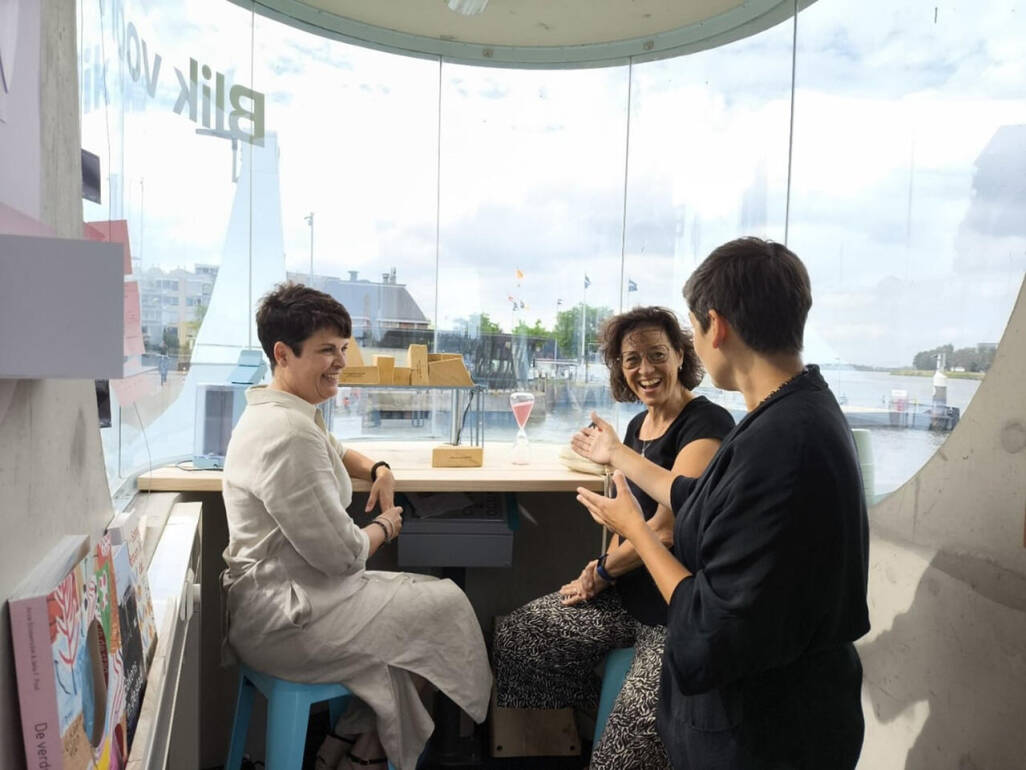 Zittend v.l.n.r.: Aarti Bajnath (specialist digitale collecties), Ankie Kesseler (directeur-bestuurder) en Jacoline de Heer (projectleider concept & inrichting).