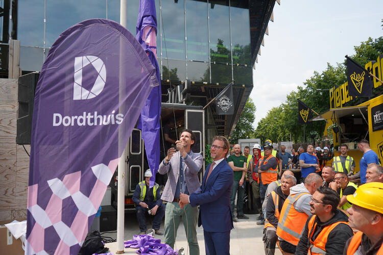 Een mijlpaal voor het Dordthuis. Op dinsdag 3 juni hesen wethouder Maarten Burggraaf (rechts) en Bas Hüsstege, manager bij Bibliotheek AanZet, feestelijk de vlag: de bouw heeft officieel het hoogste punt bereikt.