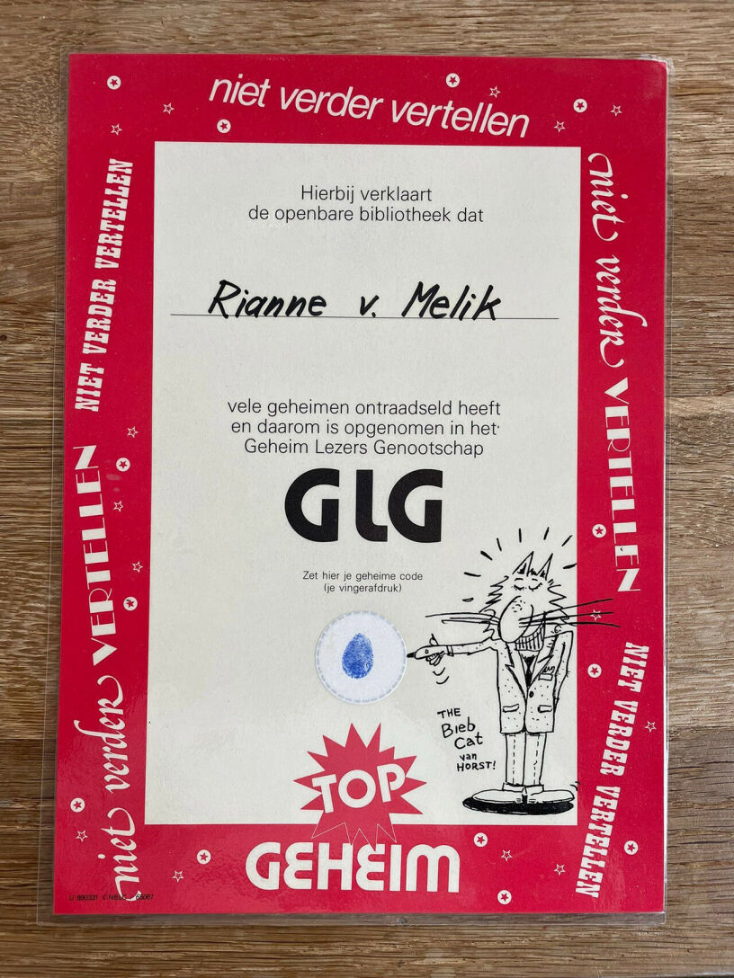 ‘Topgeheim – niet verder vertellen. Hierbij verklaart de openbare bibliotheek dat Rianne van Melik vele geheimen ontraadseld heeft en daarom is opgenomen in het Geheim Lezers Genootschap.’ Mijn kleine vingerafdruk fungeert als ‘geheime code’ op de geplastificeerde oorkonde, die ik al meer dan dertig jaar bewaar in een doos met belangrijke documenten. Al als jong meisje kwam ik wekelijks in de bibliotheek. Daar ging ik bijvoorbeeld in de knipselmappen op zoek naar informatie voor een spreekbeurt over dierproeven en bedelde ik net zo lang bij de bibliothecaresse totdat ik eerder boeken voor volwassenen mocht lenen dan mijn leeftijd toeliet. En daar deed ik mee aan iedere actie die voor de jeugd werd georganiseerd, zoals het oplossen van raadsels.