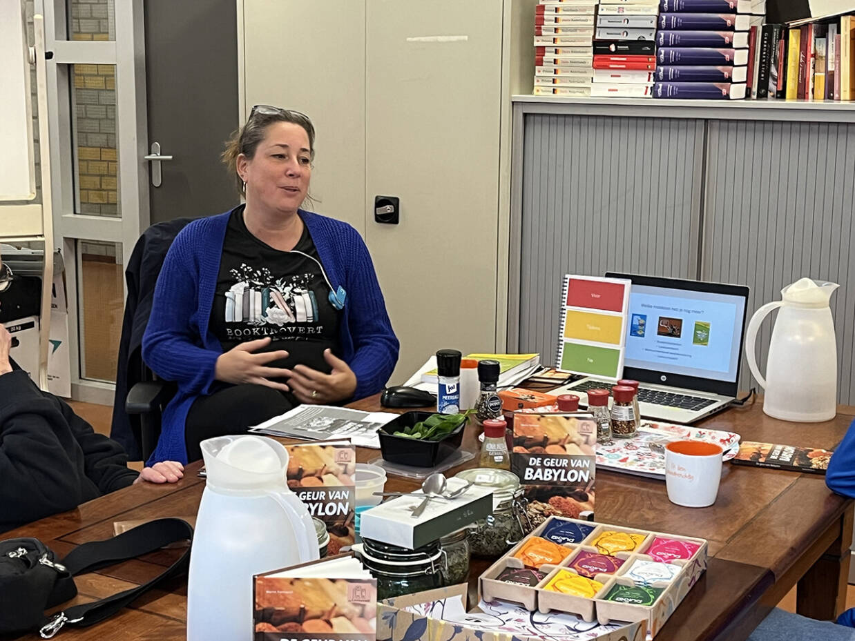 Martine de Koning neemt altijd ‘rekwisieten’ mee. ‘Door dingen mee te nemen die ook aan de orde komen in het boek, gaat het verhaal meer leven en wordt het tastbaarder.’ Op de foto is Martine op zoek naar kruiden waardoor de studenten het verhaal als het ware kunnen ruiken en proeven.