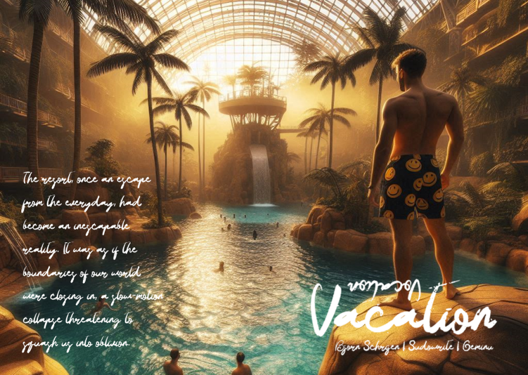 Zo pingpongen Gemini en ik een tijd ideeën over en weer. Ik beschrijf een idee voor een personage of stukje plot, ontvang daarop feedback, pas het idee weer aan, en vraag weer nieuwe feedback. Uiteindelijk kom ik zo tot een concept, waar ik mee verder wil. In de komische thriller Vocation | Vacation gaat de semi-bekende comedian Dorian na het floppen van zijn laatste show met zijn gezin een midweek naar een bungalowpark. Daar ontdekt hij echter dat er elke ochtend bungalows (en hun bewoners) verdwijnen, en dat hij het park niet meer kan verlaten! Wanhopig zoekt Dorian naar een oplossing voordat ook hij en zijn gezin verdwijnen, maar tot zijn verbijstering wordt het gevaar volledig ontkend of genegeerd door de andere – kleurrijke – vakantiegangers. Wat er precies aan de hand is, laat de roman in het midden. Is alles een absurdistische sketch die Dorian vertelt tijdens een van zijn shows? Moet het verhaal gelezen worden als een metafoor voor klimaatverandering? Is het bungalowpark eigenlijk een glitchende simulatie (onverwachte output die het gevolg is van een kortdurende elektronische of softwarematige storing, red.) van een AI-systeem?