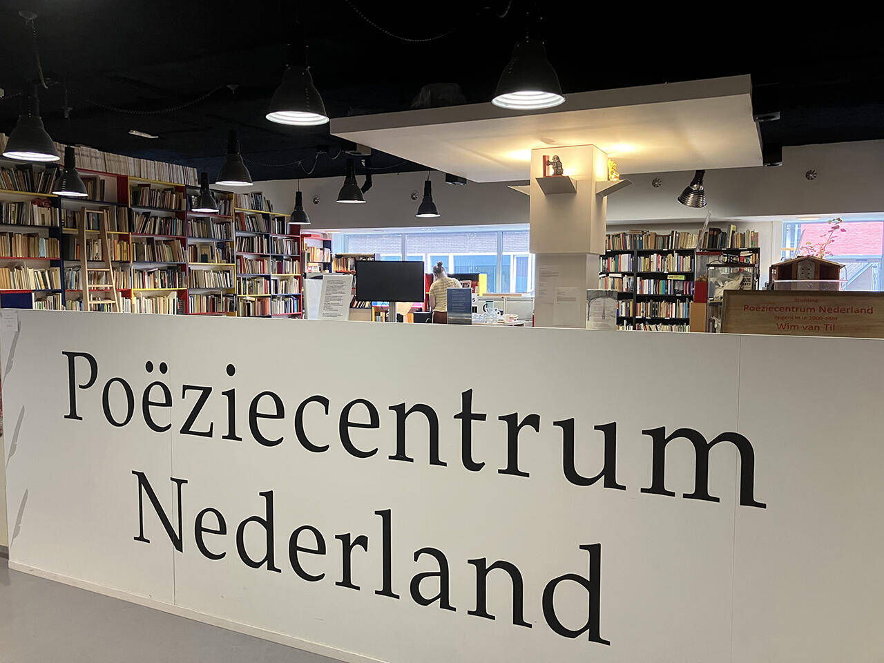 Het Poëziecentrum zit wat verscholen achterin, maar valt evengoed onmiddellijk op. In de bibliotheek staan alle boeken overal netjes in het gelid, ogenschijnlijk gloednieuw, stuk voor stuk voorzien van harde kaft en informatiesticker op de rug, met veel lege ruimte op de planken. Wit is de overheersende kleur. Het Poëziecentrum heeft de uitstraling van een gezellig antiquariaat: overvol, zeer ongelijksoortige, oude boeken. En alles oogt beige.