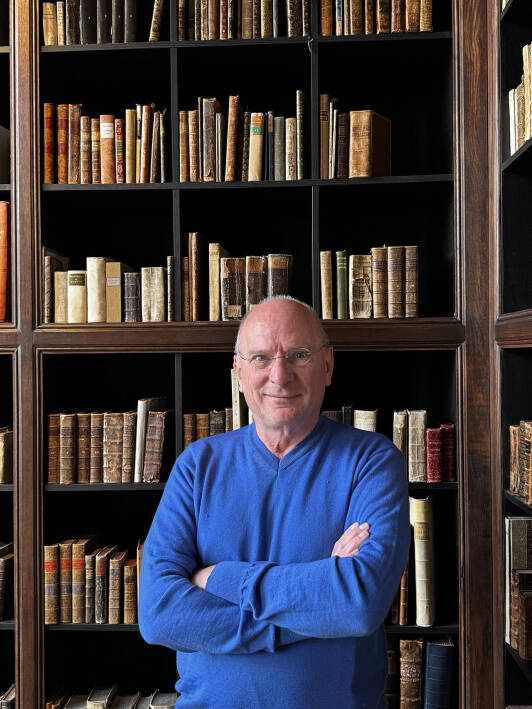 De Bibliotheca Philosophica Hermetica (BPH) is de meest complete boekencollectie ter wereld op het gebied van de christelijk-hermetische gnosis, Jacob Böhme, en de Rozenkruisers, vertelt Dijstelberge enthousiast. Hij ontvangt me in de volop bloeiende tuin achter het Huis met de Hoofden, aan de Keizersgracht 123, waarin de bibliotheek sinds 2017 is gehuisvest. Na een lange loopbaan in het boekenvak – onder meer als adjunct conservator bij de Universiteitsbibliotheek van de UvA en universitair docent boekgeschiedenis – is hij sinds 2023 de bibliothecaris van de BPH. Hij is druk met het verwerken van een omvangrijke schenking van wijlen antiquair Wilma Schuhmacher en het voorbereiden van een tentoonstelling. ‘Maar,’ zegt hij, ‘hier werken is zo leuk dat het niet voelt als werken.’
