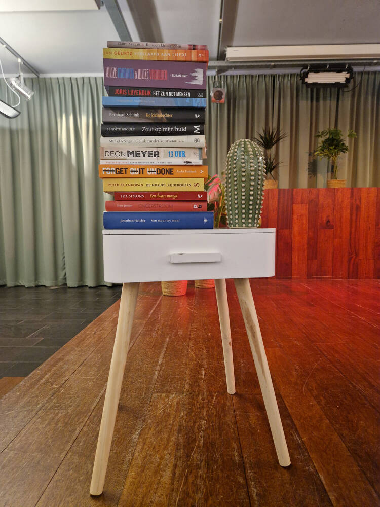‘Aan iedere spreker vragen we van tevoren welk boek grijpklaar op ieders nachtkastje moet liggen en waarom. Op de avond zelf ligt dat er ook écht.’ We blijven tenslotte een bibliotheek.’