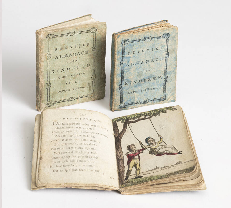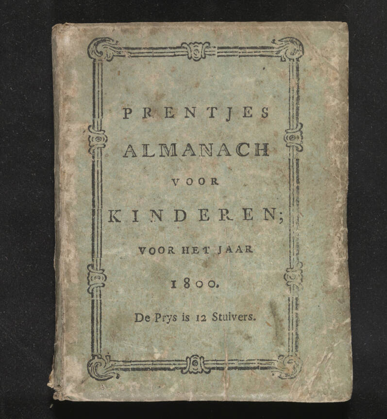Onlangs verwierf de KB op veilingen een aantal exemplaren van de extreem zeldzame reeks Prentjes Almanak voor Kinderen, die firma Houtgraaf te Amsterdam uitgaf tussen 1795 en 1840. De naam van de reeks is door de jaren heen op verschillende manieren gespeld: Prentjes of Printjes, Almanak of Almanach. Er zijn 45 van deze kinderalmanakken verschenen en helaas is driekwart daarvan verdwenen. De KB bezit negen almanakken uit deze reeks. Drie daarvan zijn recent aangekocht, namelijk de exemplaren voor de jaren 1800, 1802 en 1822. Ze zijn opgenomen onder aanvraagnummer KW GW T100064.