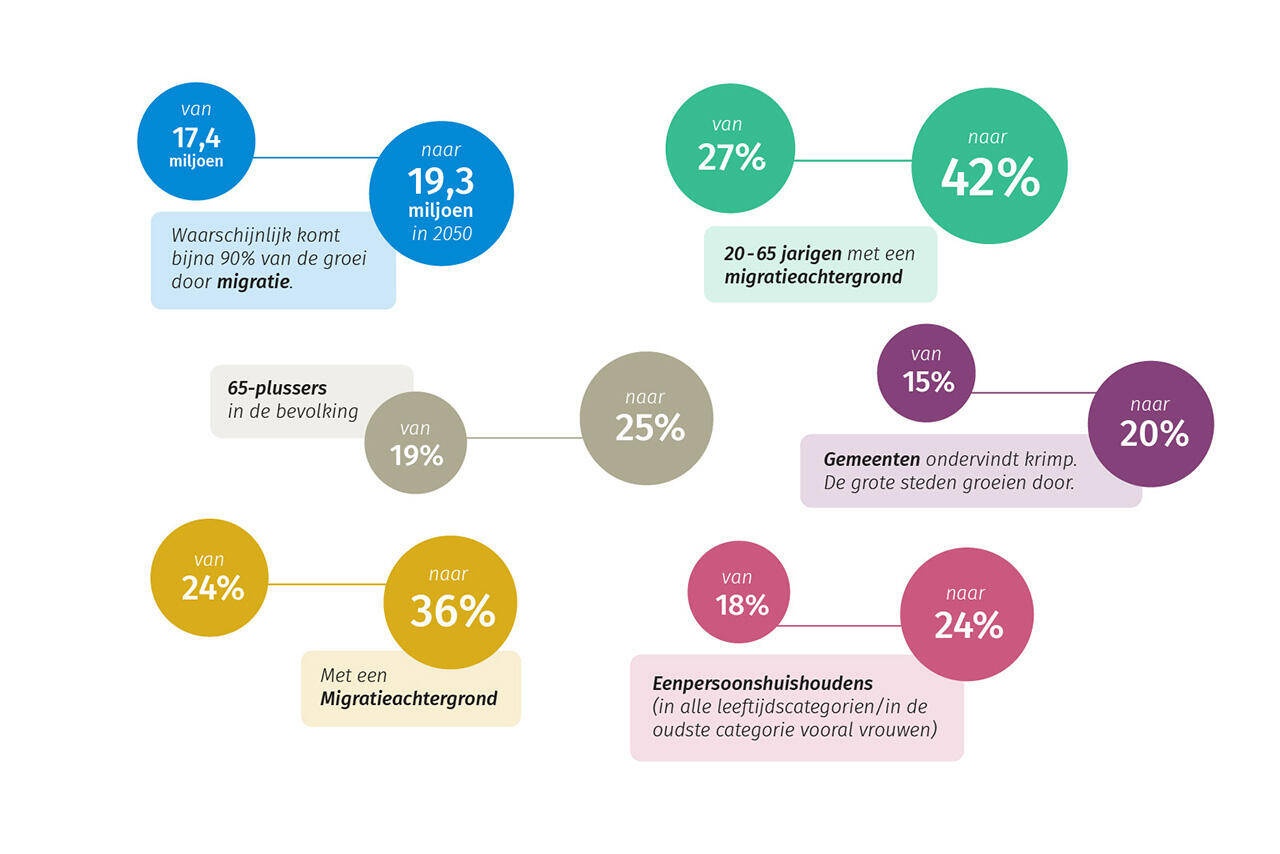 Een heel belangrijk, misschien wel het belangrijkste, aspect aan de veranderende context waarin (Nederlandse en West- Europese) bibliotheken zich bewegen is de verschuivende demografie. Uit verschillende onderzoeken4blijkt dat Nederland diverser, drukker en grijzer zal worden. Deze voorspellingen zijn niet onverwacht maar vertellen wel het verhaal van hele grote en belangrijke verschuivingen. Als je over 25 jaar in een zomerse rij staat te wachten bij een ijscoman, heeft bijna de helft van alle werkende volwassenen in de rij een migratieachtergrond en zijn bijna drie van de tien mensen boven de 65 jaar oud. Bovendien zijn we met veel meer en wonen er steeds meer van ons in de stad. Deze verschuivingen hebben een impact op onnoemelijk veel facetten van onze samenleving, van de beschikbaarheid van zorgpersoneel tot de manieren waarop we communiceren en het anders nadenken over de maatschappelijke waarde van ouderen. En deze impact zien we in de kiem nu al.