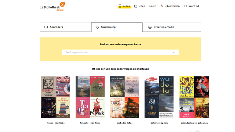 Bibliotheek AanZet heeft een uitgebreide boekzoektool op onze website, genaamd Bookarang. Dat is een Spotify- of Google-achtige benadering met heel veel zoekmogelijkheden. Je kunt niet alleen zoeken op auteur, titel, ISBN of onderwerp, maar ook op sfeer en emotie, en zelfs op dikke boeken en dunne boeken.
